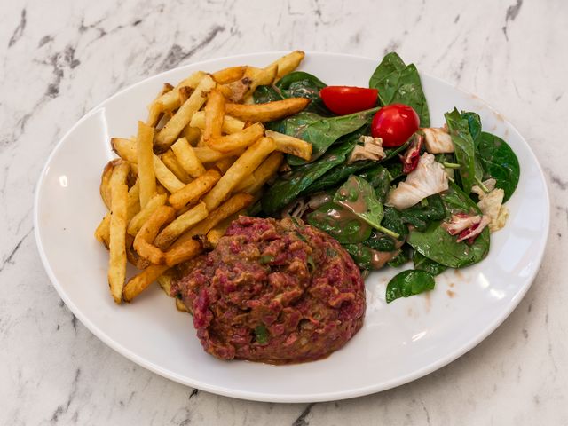 Buns brioché, Steak Haché Français 150gr, Sauce cocktail, Crème de Cheddar, Salade, Tomate, Oignons confits, Pickles de Concombre & d'Oignons confits.